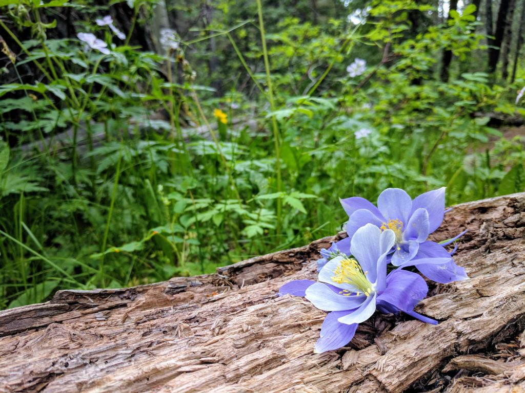 On the way to the meadow, someone had plucked two columbines and set them artistically on a log.